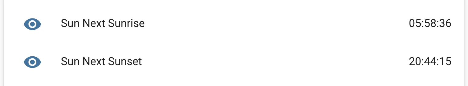 # Example configuration entrytext_sensor: - platform: sun name: Sun Next Sunrise type: sunrise - platform: sun name: Sun Next Sunset type: sunset